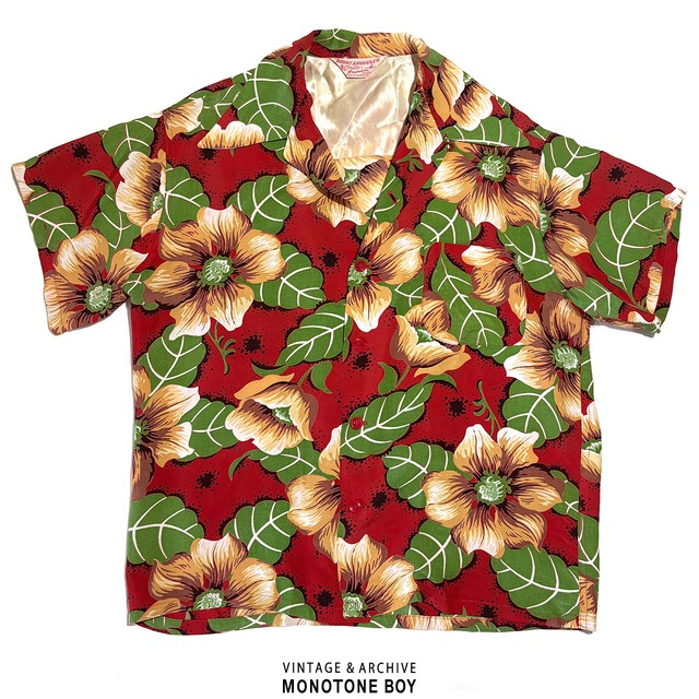 ◼︎Item Specs Brand:HAUOLI KAMAAINA Season:50’s Country:Made in California Color:RED Green beige Material:- Size: M 身幅:57 肩幅:46 袖丈:18 裄丈:44 着丈:66 (cm) model 176cm 60kg ⸻⸻⸻⸻⸻⸻⸻⸻ ◼︎Item Detail 50’s Vintage Aloha Shirt 【HAUOLI KAMAAINA 】 1950年代、カリフォルニア製のアロハシャツ。まさにトゥルーヴィンテージ 生地はおそらくレーヨンの美しいドレープ、他にはない発色が素晴らしいトロピカル柄、クラシックな襟と赤いボタン。50年代当時の空気感を色濃く残した1着。 サイズMですがやや小さめのため女性にもおすすめします。 ゆるいサイズ感からより戻しであの頃のようなタイトなサイジングが今は新鮮に映ります。ボトムを太くしてAラインを作ったり、着画のようにあえてワイドスラックスと合わせて、少しルードなムードに。秋にはモヘアカーディガンやタキシードジャケットを羽織って、テッズやロカビリー要素を足せば、50’sロックの匂いも楽しめるスタイリングを提案。 あえてワイドスラックスと合わせて、少しルードなムードに。 さらにモヘアカーディガンやタキシードジャケットを羽織って、テッズやロカビリー要素を足せば、50’sロックの匂いも楽しめるスタイリングに。 ヴィンテージアロハの醍醐味が凝縮された滅多に出ない一点もの。 コレクション用にも、スタイリングの主役にも。 着るたびに惚れ直すような、風格を備えたアロハです。 1950年代、カリフォルニア製のアロハシャツ。まさにトゥルーヴィンテージ。 生地はおそらくレーヨン。美しいドレープと発色のいい他にはないトロピカル柄。 クラシックな襟元に赤いボタンが映え、当時の空気感を色濃く残した1着です。 サイズ表記はMですが、実際はややコンパクト。 女性にもおすすめできるサイズ感で、今の空気感にもフィットします。 “ゆるい”だけが正解だった時代から、少しずつ戻りつつあるタイトなシルエット。 ボトムを太めにしてAラインをつくると、逆に今っぽいバランスに。 着画のようにブラックのワイドスラックスと合わせれば、 程よくルードなムードに仕上がります。 さらに秋には、モヘアのカーディガンやタキシードジャケットを重ねて。 テッズやロカビリーの香りをほんのり加えれば、50’sロックな空気も漂います。 ヴィンテージアロハの醍醐味が凝縮された、滅多に出ない一点もの。 コレクションにも、スタイリングの主役にも。 着るたびに惚れ直すような風格を備えたアロハです。 ◼︎Condition:【C】 トップボタンが一つ欠損。一番下のボタン付近に小さな穴。襟にダメージ。右肩丸印の箇所に傷小穴があります。左脇の裏側と表、裾脇に少しのステッチのほつれ。 オリジナル状態を残すためあえて補修はしておりません。生地はしっかりとして発色が良く全体的にはいい状態です。丁寧に扱えばこれからも愛用いただける状態。気になる部分などは写真でご確認いただけます。 ⸻⸻⸻⸻⸻⸻⸻⸻ ◼︎ Attention 【返品】古着のためご注文後のキャンセルは理由の如何に問わずお受け致しかねます。 【お支払いについて】全て株式会社BASEが提供し当店で使える決済方法をご利用いただけます。代引きはお受けしておりません。 【領収書・納品書】納品書の発行及び同梱は致しません。適格事業者のためインボイスのダウンロードが可能です。発送後の株式会社BASEからのメールをご覧ください。 【発送】ご注文から3営業日以内にご発送いたします。システム上お届け日の指定はできません。配送方法の指定はできません。シャツや薄手のパンツなど小さく畳めるものは郵便受けに届くゆうパケットポストを利用します。その他は日本郵便の「かんたん発送」を利用します。 【営業時間】平日10時から16時 土日祝祭日はお休み 【状態基準】 【N】新品同様もしくはタグ付き(新品ではない) 【S】全体的に着用感少ない非常に状態が良い 【A】使用感少なめで目立たない薄シミや小さな傷で全体非常に良い状態 【B】多少使用感があるが、目立ったダメージ・汚れはない(一般的な古着の状態) 【C】使用感や部分的に目立つダメージや汚れあり 【D】過度の使用感、目立つダメージや汚れがあるが使用は可能 ご購入前に必ずショッピングガイドをお読みください。 https://monotoneboy.theshop.jp/p/00001