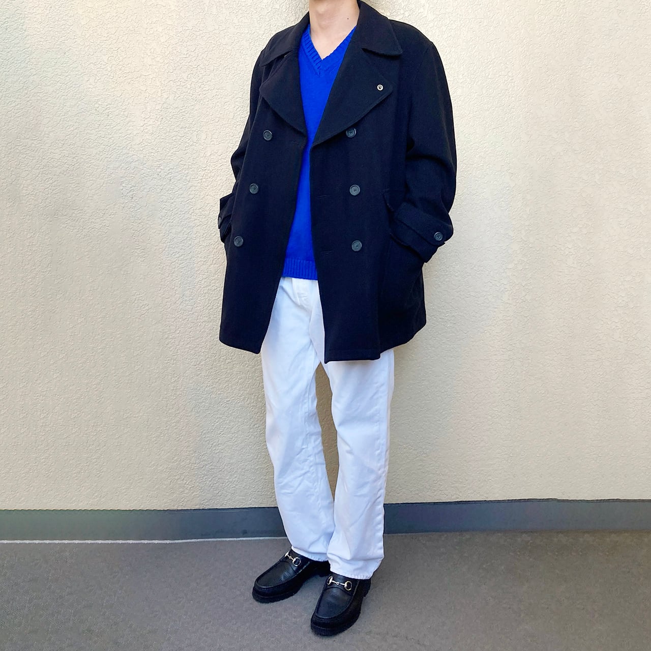 着画コーデはリーバイスアメリカ製501ホワイトにLLビーンスコットランド製コットンVネックニットを合わせました。単調になりがちなピーコートコーデに青のモード感を足して個性を演出しました。他にはカーゴパンツとグレースウェットでミリタリーコーデも良いですしグレースラックスとボタンダウンシャツで王道トラッド合わせも素敵です。