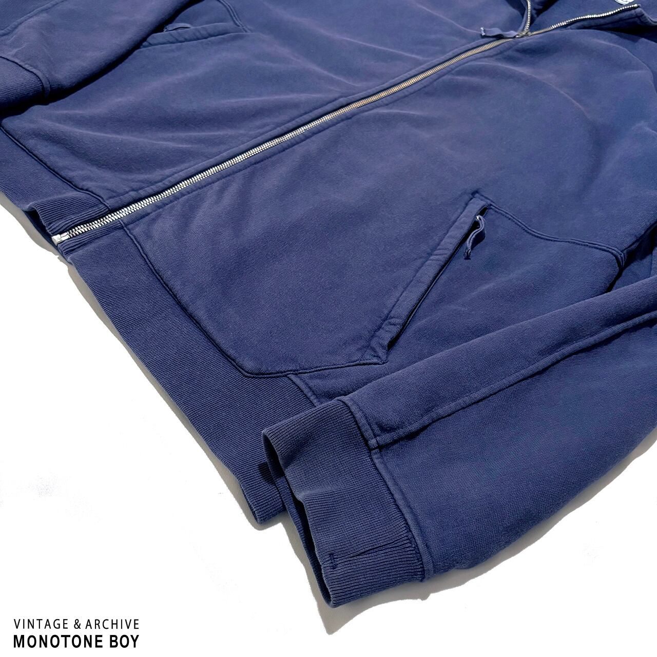 全体色褪せ、特に襟の内側と袖口は赤みが出るほど変色しています。全体縮みによる波打ち。右ポケット付近に変色部分あり。生地やファスナーはしっかりしています。これからも長く愛用いただける状態。気になる部分などは写真でご確認いただけます。