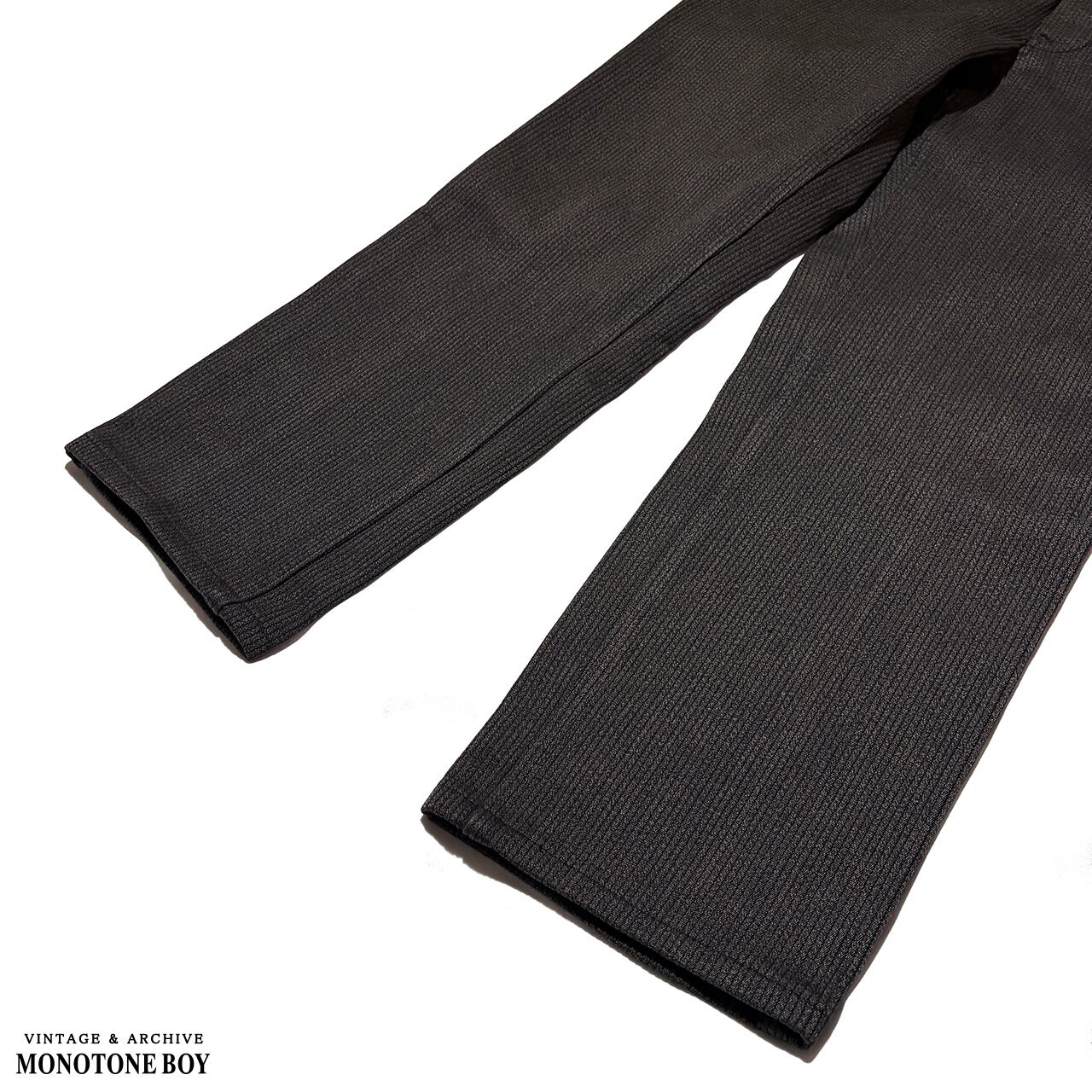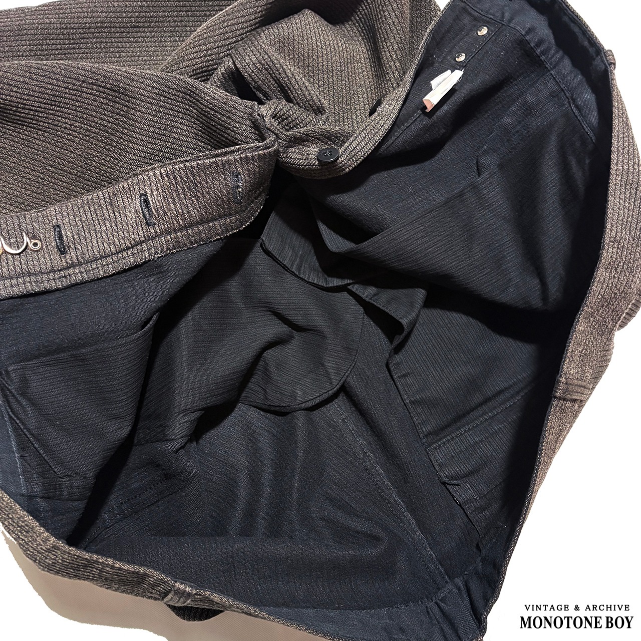 黒とダークブラウンのストライプが織りで表現され、光の当たり方でコーデュロイのような陰影を生み出します。肌触りは滑らかで、現行品と見間違えるほどの完成度。