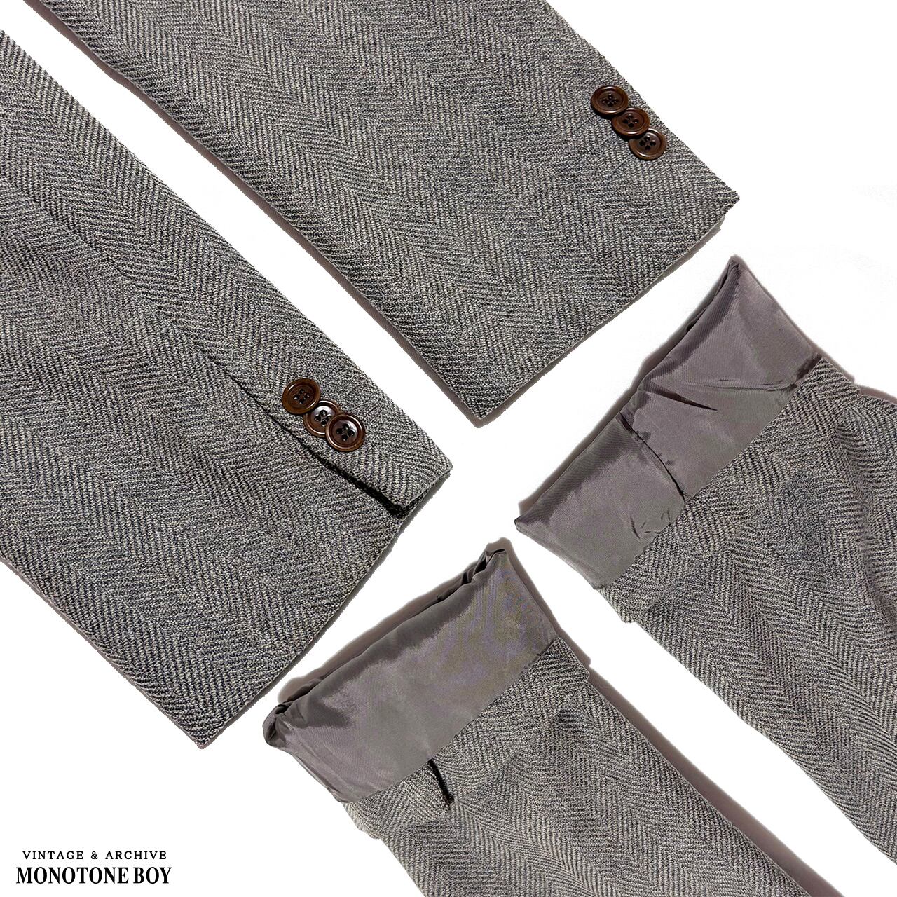 00年代イタリアブランドらしいクラシコスタイルの身体に沿うような美しいシルエットにパットがしっかり入り構築的でありつつ丸みのある柔らかい肩周りはアルマーニならではの卓越したテーラリングによる物。カジュアルなヘリンボーンツイードながらエレガントなノーベント仕様。