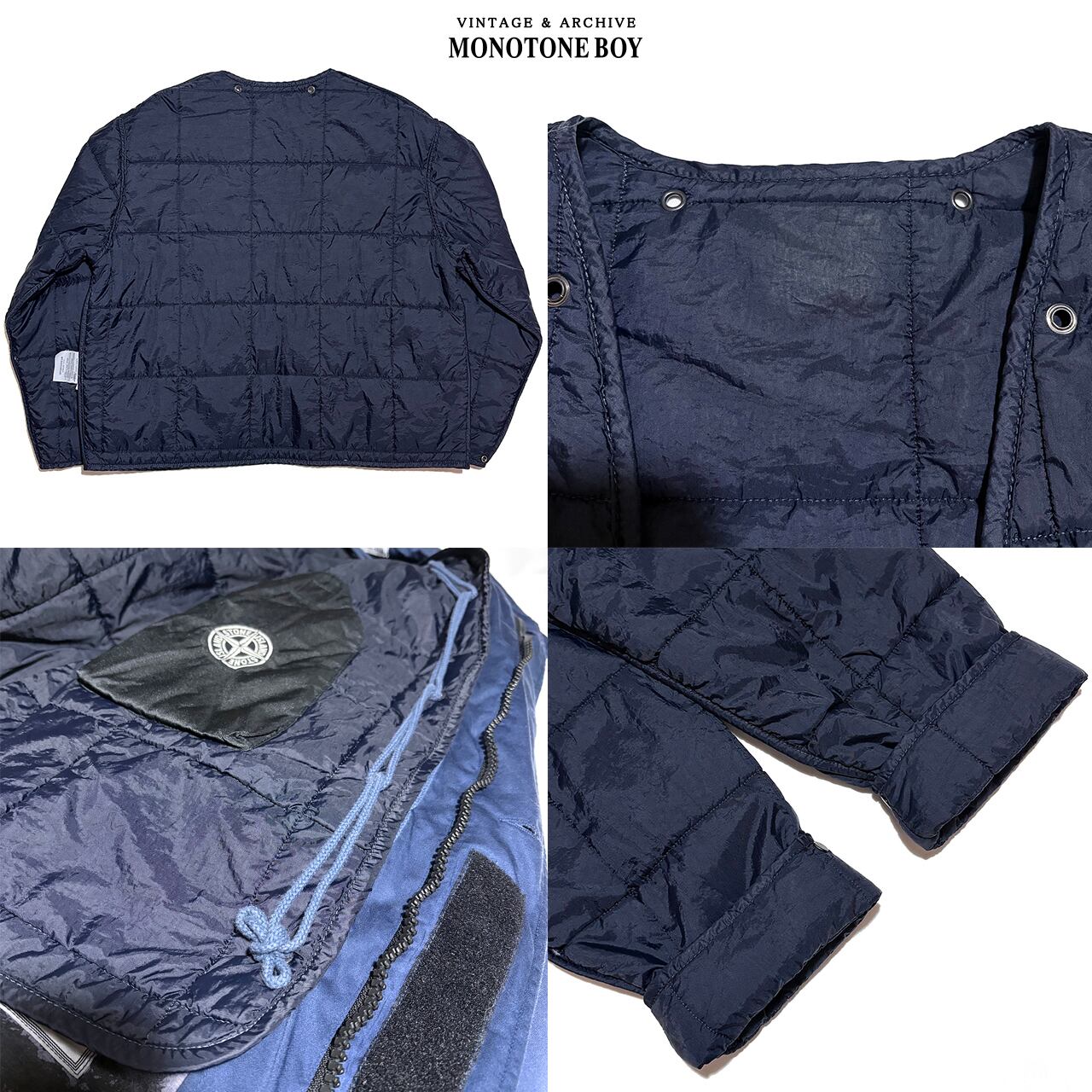 Dutch Rope Liner は紐で着脱できる古いミリタリー由来の仕様で、ストーンアイランドでは初期から受け継がれてきた伝統ディテール。単体で着用できるようスナップが付くため、ライナー単品でも高額取引されるほど希少です。