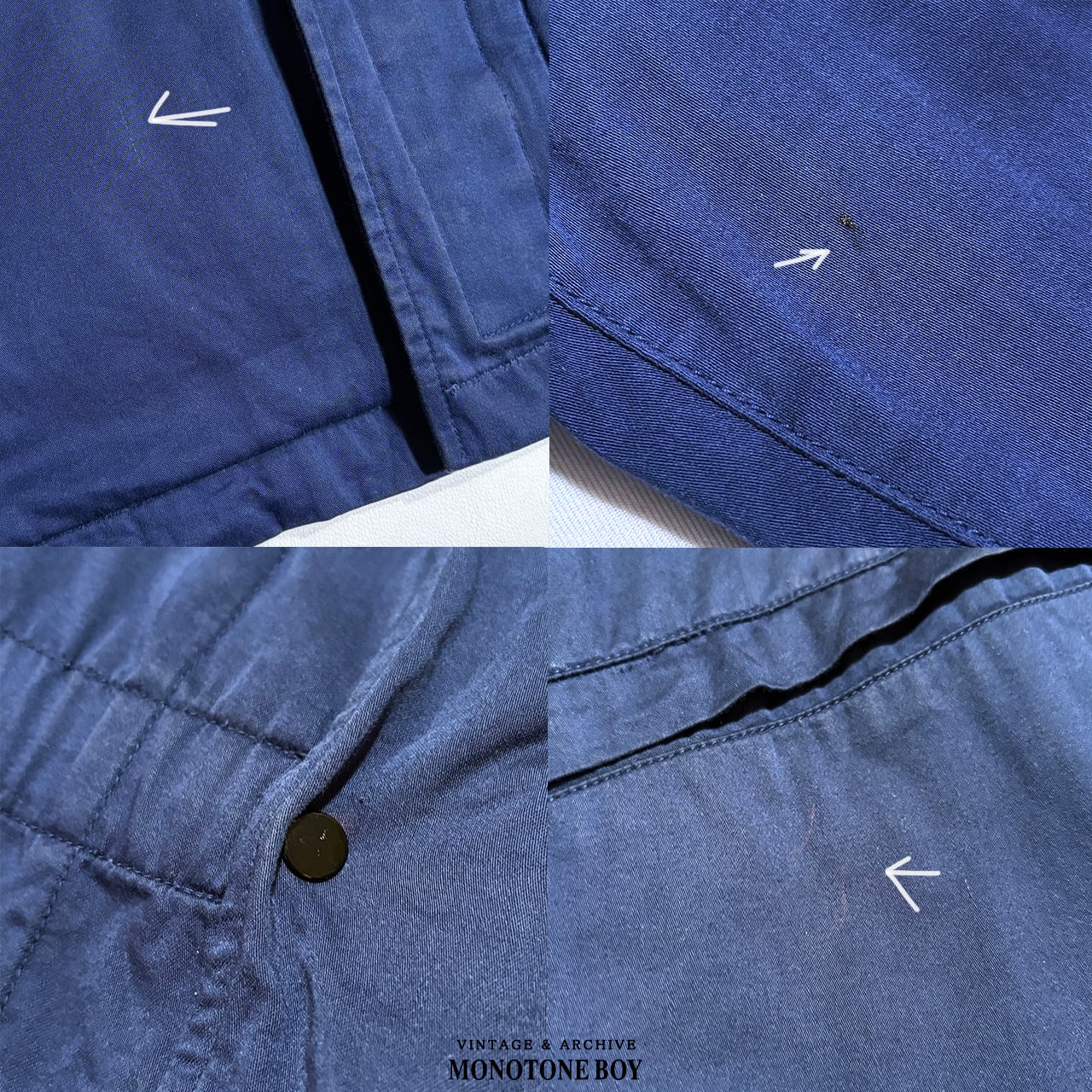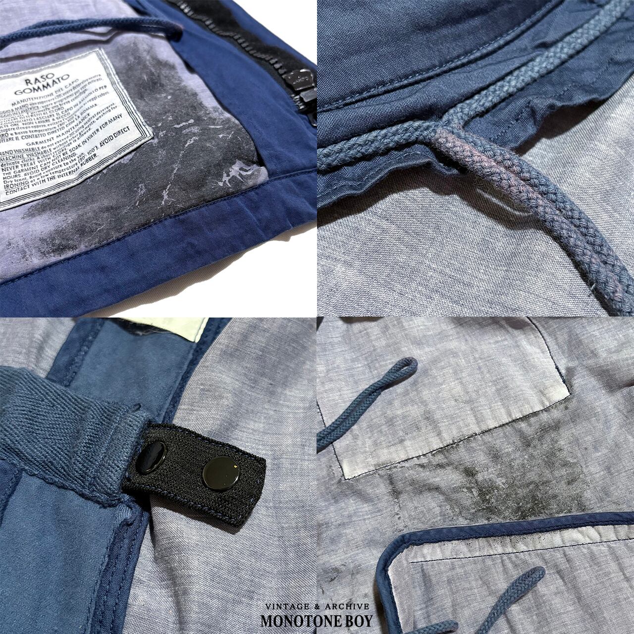 左袖の内側にコーティングによる小さな汚れ。お腹付近に薄汚れと糸のつり。袖口の汚れと褪色。襟周りの薄汚れ。ライナーはとても綺麗です。表地の裏にコーティングが黒く残っていますが表面にはほとんど出ていないため綺麗です。RASOのヴィンテージ品でここまで綺麗なのはなかなかなくこれからも長く愛用いただける良い状態。気になる部分などは写真でご確認いただけます。