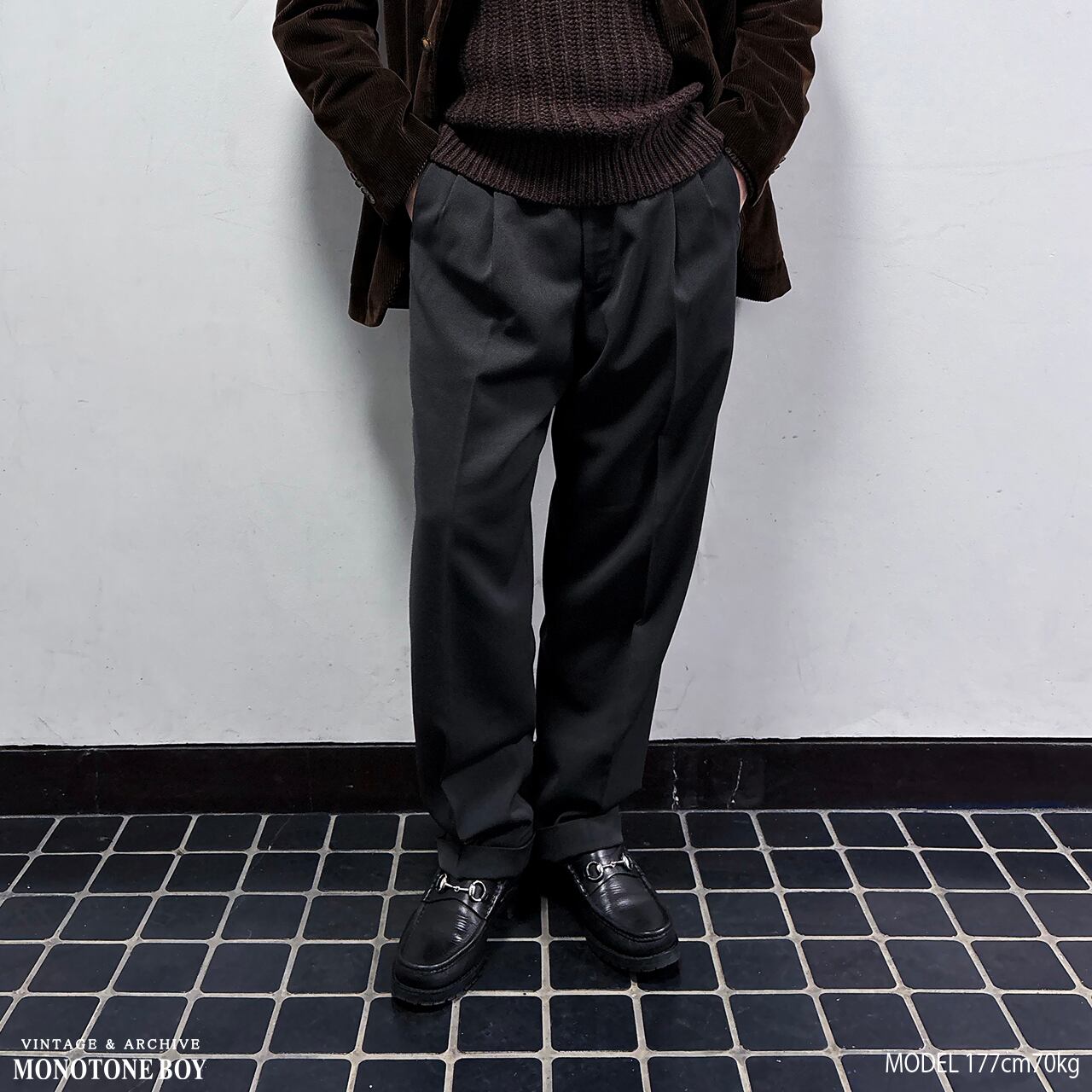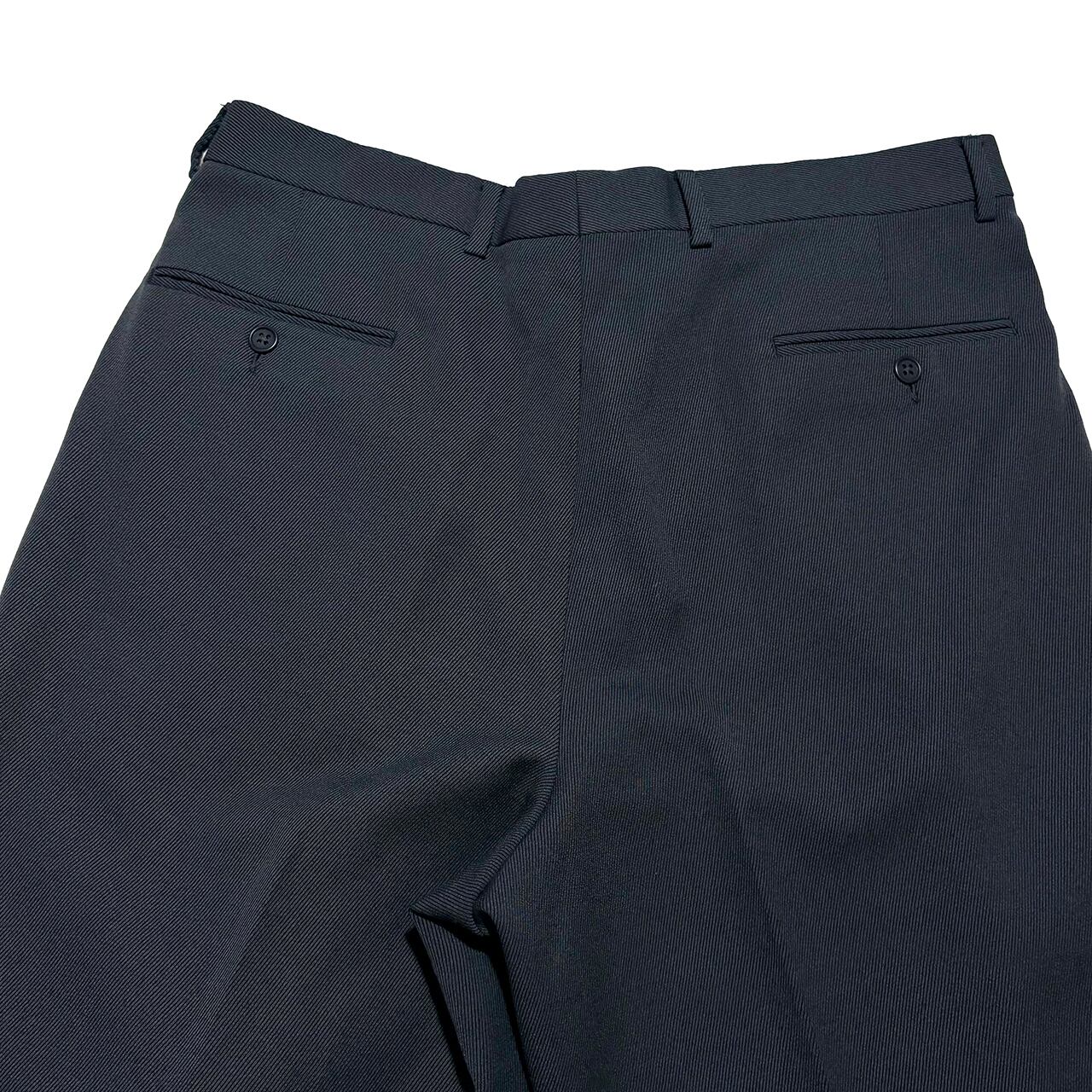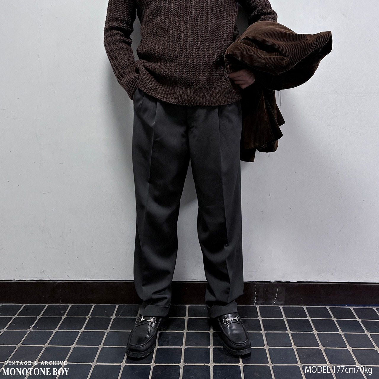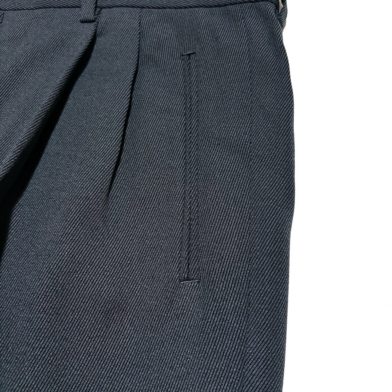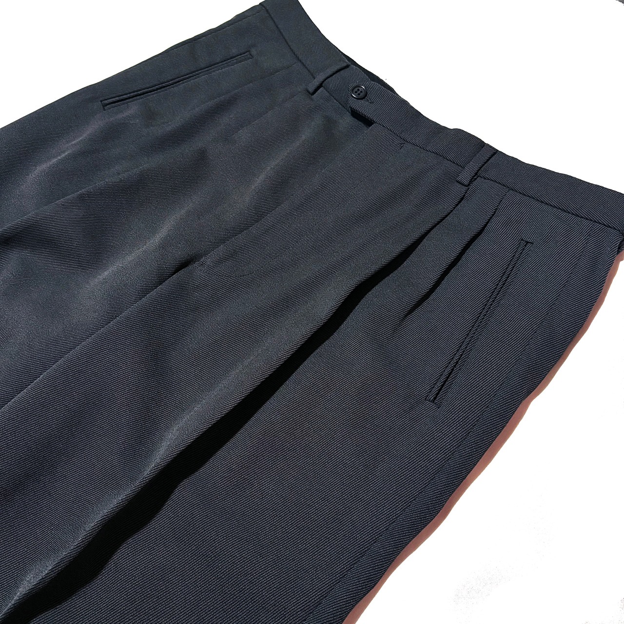 中厚のしなやかなで美しいドレープを生み出すウールブレンドツイル生地はシワになりにくく耐久性もある実用性の高い一本。秋冬の重厚なアウターに負けない重厚感と落ち着いた少しだけグリーンを感じるダークグレーで冬の大人の装いを完成させる。