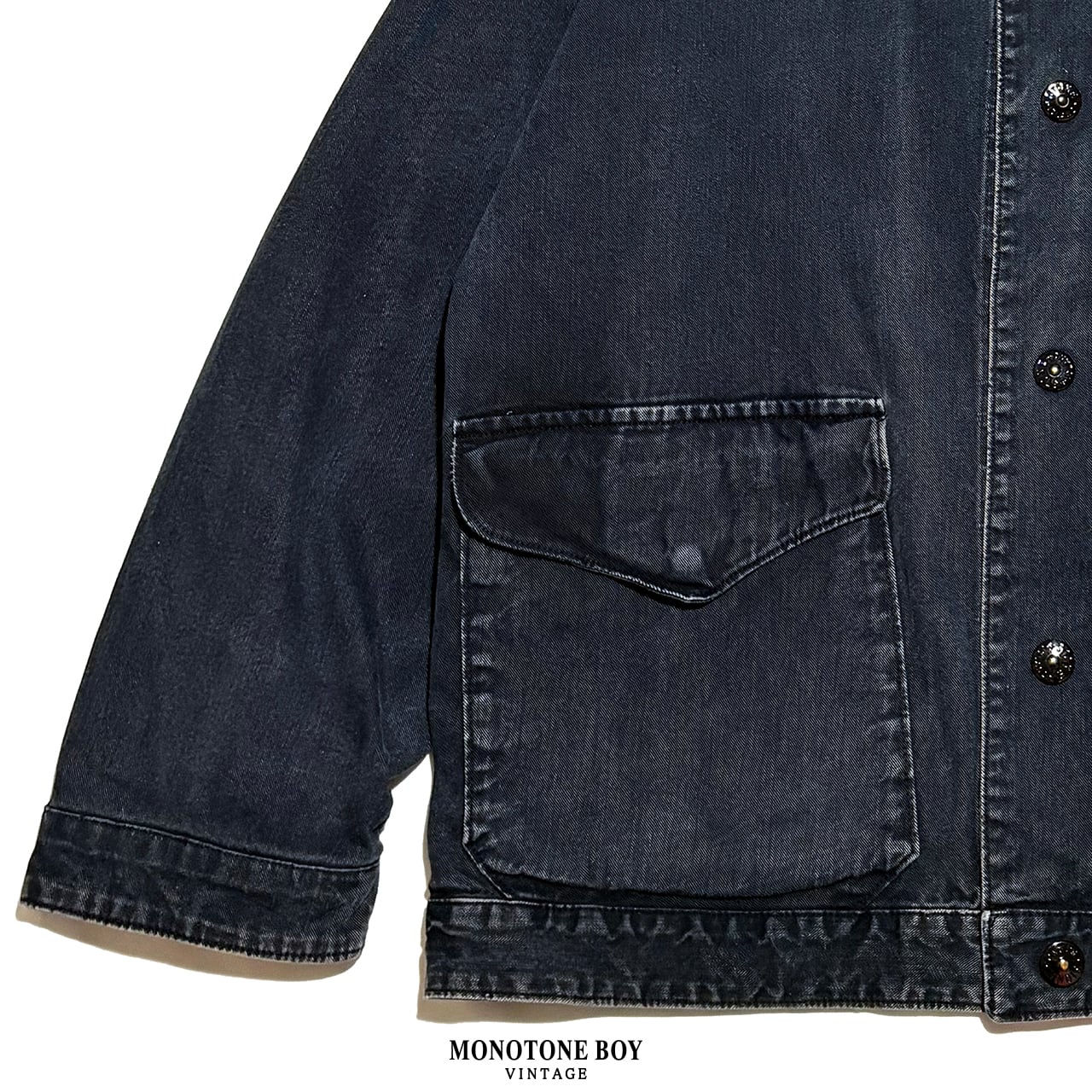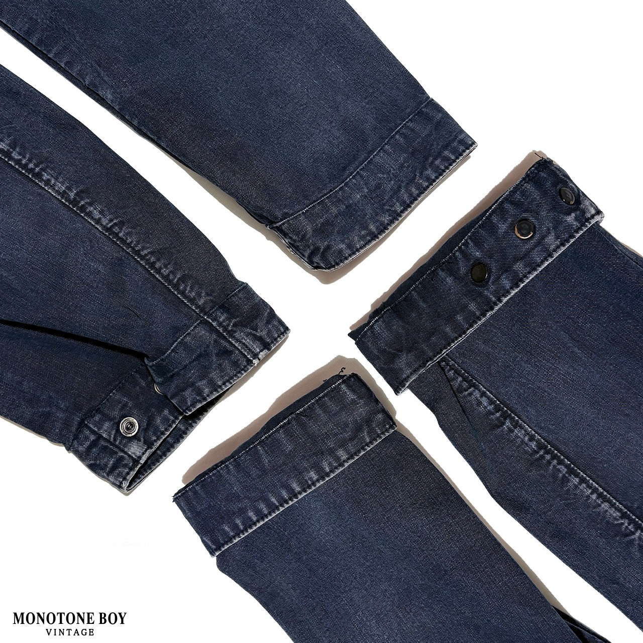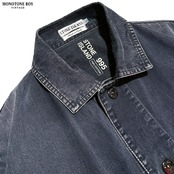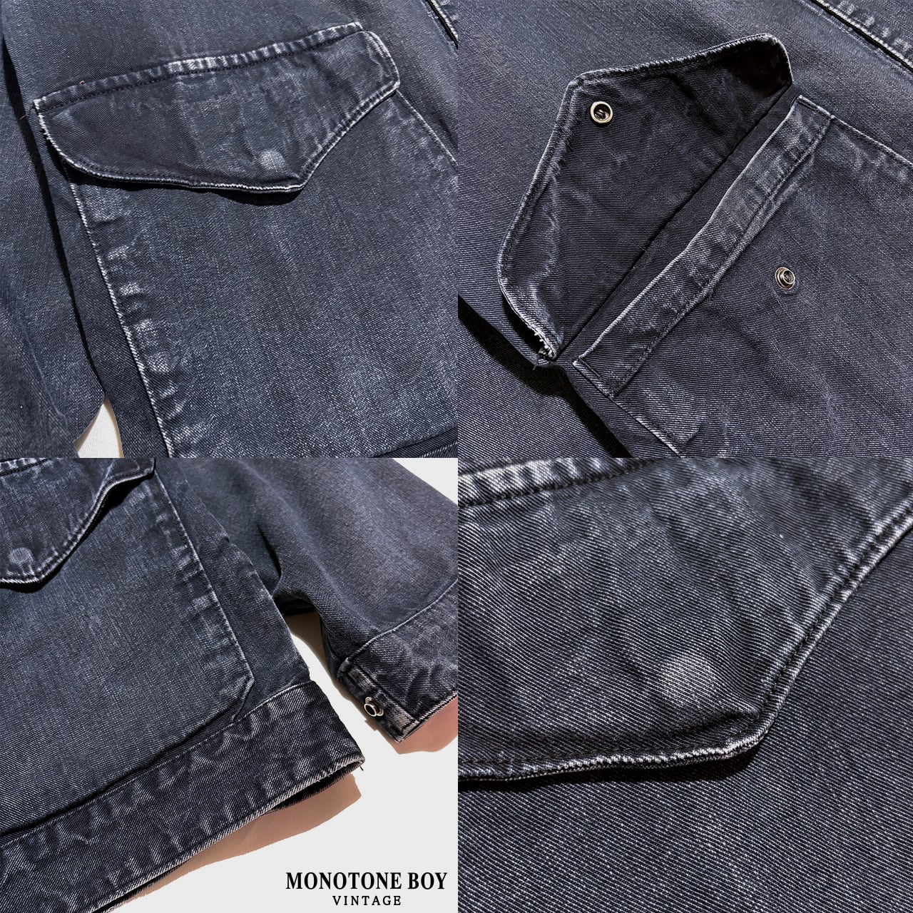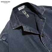コットン100%のオリジナルデニムライク素材を採用。細かな縦落ちが現れ、ポケットや襟周りには下糸の白が浮かび上がることで、ヴィンテージデニムのような立体的なコントラストを形成しています。加工ではなく時間の経過によって生まれた表情が魅力です。